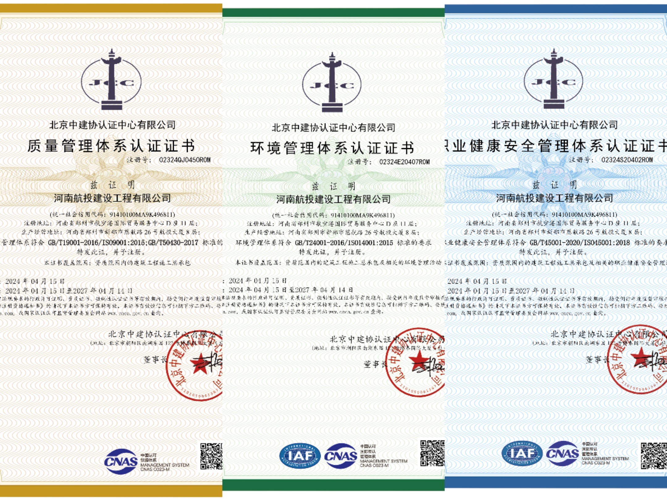 4月15日,河南航投建設(shè)工程有限公司(以下簡(jiǎn)稱航投建工)通過ISO9001質(zhì)量管理體系、ISO14001環(huán)境管理體系、ISO45001職業(yè)健康安全管理體系(以下簡(jiǎn)稱ISO三體系)認(rèn)證并獲得證書,這標(biāo)志著航投建工的規(guī)范化標(biāo)準(zhǔn)化管理邁上新臺(tái)階,為持續(xù)提升市場(chǎng)競(jìng)爭(zhēng)力、拓展合作新領(lǐng)域打下堅(jiān)實(shí)基礎(chǔ)。