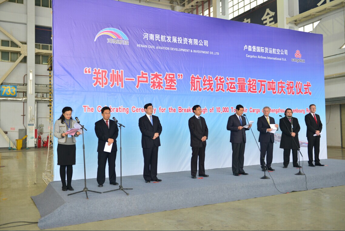河南省副省長(zhǎng)趙建才參加儀式并致辭,他指出,“鄭州-盧森堡”國(guó)際貨運(yùn)航線架起了橫貫中歐大陸的“空中絲綢之路”。“一路飛跨中歐,天塹變通途”,截至今日,該航線累計(jì)貨運(yùn)量已突破萬(wàn)噸,為鄭州國(guó)際機(jī)場(chǎng)貨運(yùn)量的快速提升作出了突出貢獻(xiàn)!這一成績(jī)的取得,是河南省與盧貨航優(yōu)勢(shì)互補(bǔ)、合作共贏的成功典范,更是“雙樞紐”戰(zhàn)略推動(dòng)實(shí)驗(yàn)區(qū)發(fā)展的生動(dòng)實(shí)踐。當(dāng)前,鄭州航空港經(jīng)濟(jì)綜合實(shí)驗(yàn)區(qū)發(fā)展態(tài)勢(shì)良好,希望盧貨航與河南航投搶抓實(shí)驗(yàn)區(qū)戰(zhàn)略機(jī)遇,不斷拓寬合作領(lǐng)域,豐富合作內(nèi)容,加快推動(dòng)合資貨航組建和飛機(jī)維修基地建設(shè),積極培育參與國(guó)際分工合作新優(yōu)勢(shì),努力促進(jìn)鄭州與盧森堡乃至歐亞之間的經(jīng)貿(mào)合作和人文交流,為建設(shè)鄭州航空港經(jīng)濟(jì)綜合實(shí)驗(yàn)區(qū)做出新的更大的貢獻(xiàn)。